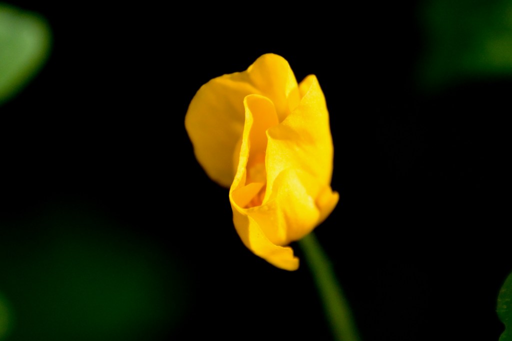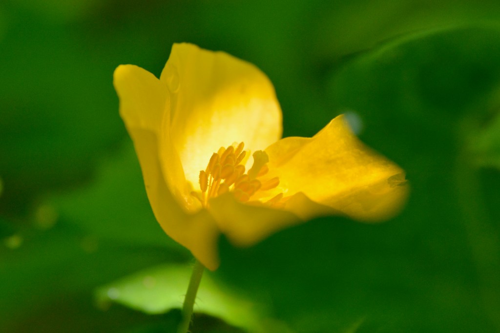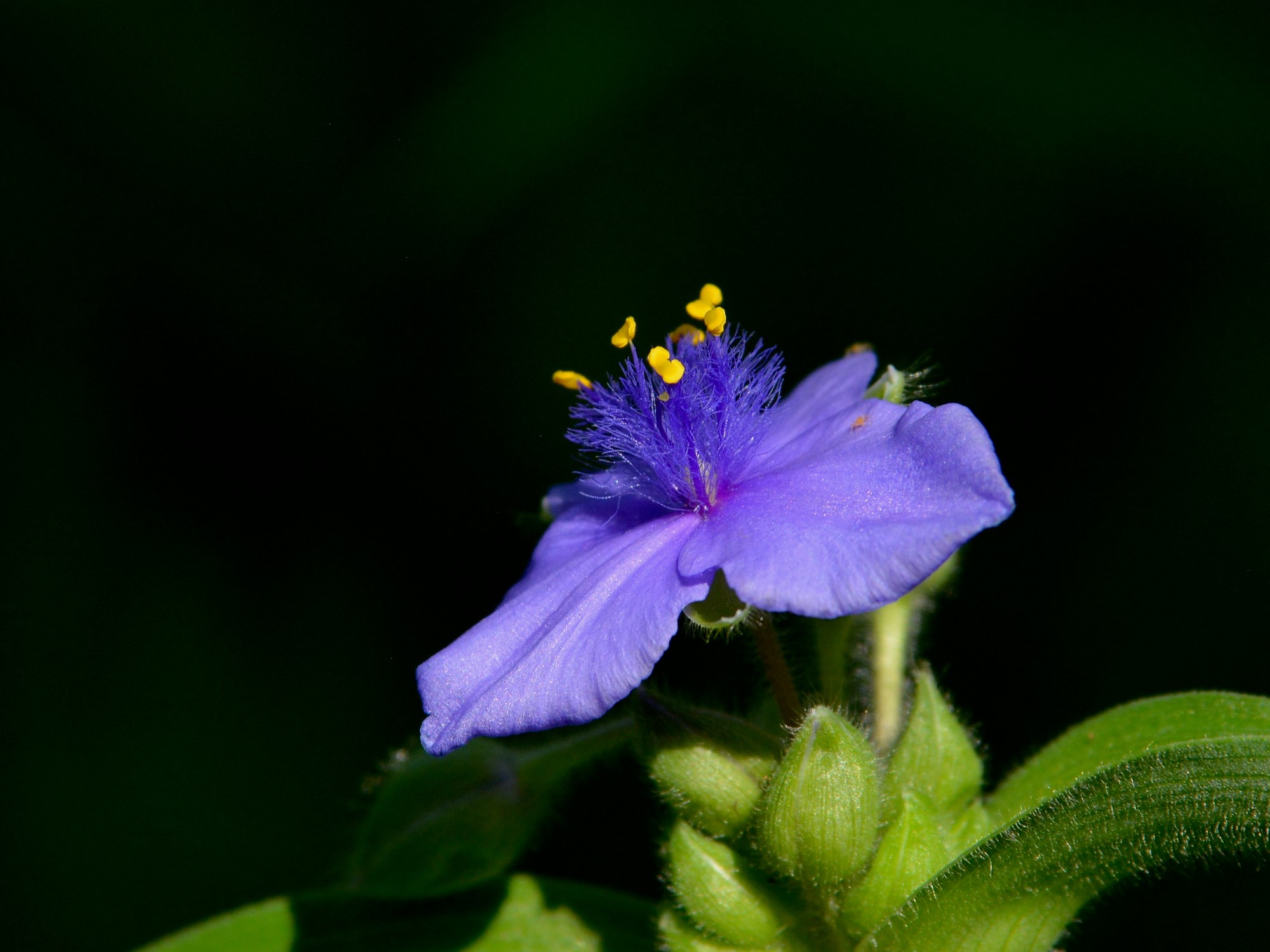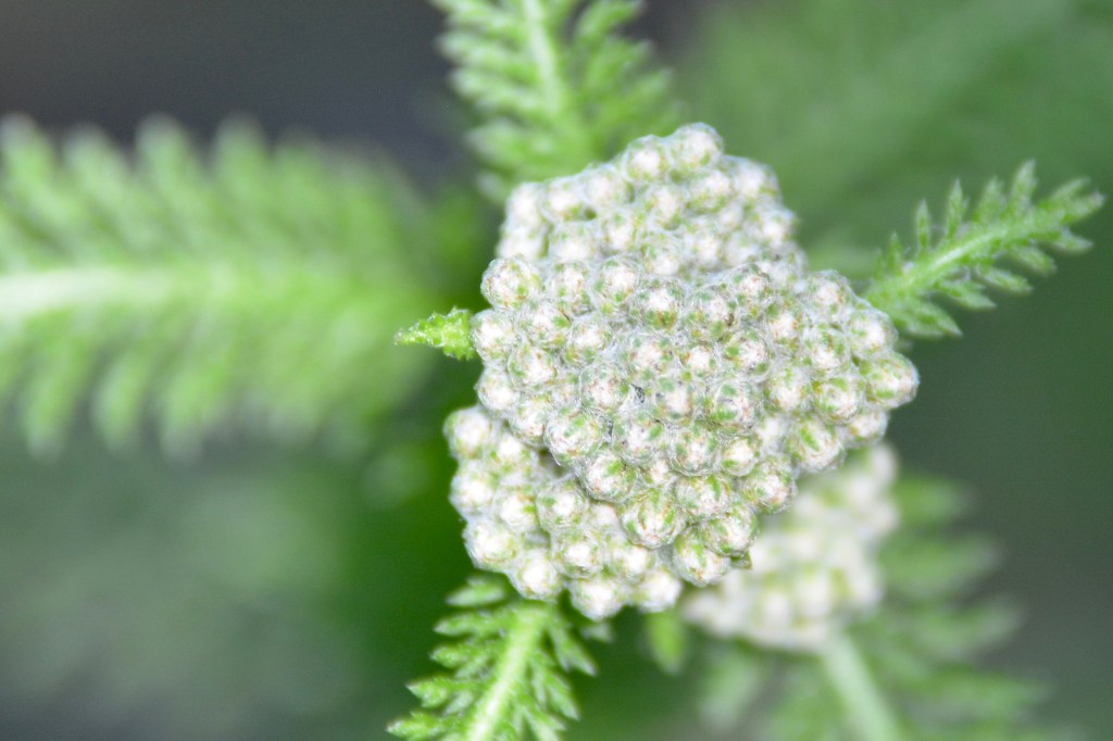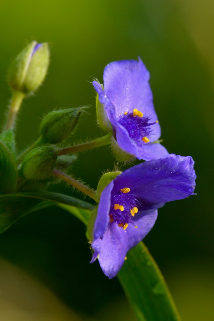 Spiderwort seems to be hitting its peak on the trail.Bush honeysuckle is an invasive species, which I found out while identifying this plant. It’s associated with ticks and its berries are basically junk food for wildlife. I guess I can add cutting down the ones I’ve seen on the edge of my property to my list of summer projects.Did I mention the spiderworts are prevalent?I can’t believe the poppies are still blooming! I guess the temperatures have been just right this spring. This one was snugged in the back of the patch under overhanging foliage, but a shaft of sunlight hit it in just the right way to make it seem like it was lit from within.If you look closely, you can just see the pistil inside.Last spiderwort, I promise! (For this post anyway.) What I love about this picture is that the lighting isn’t harsh, and the black background makes the center parts stand out. It’s almost like a sea anemone perched on a flower.Yarrow about to bloom. This flower is not only pretty, but it’s a native perennial. It can spread readily, although I’ve notice in my flower bed that it’s being pushed out by the lemon balm and bee balm. It also has lots of uses as a medicinal herb.