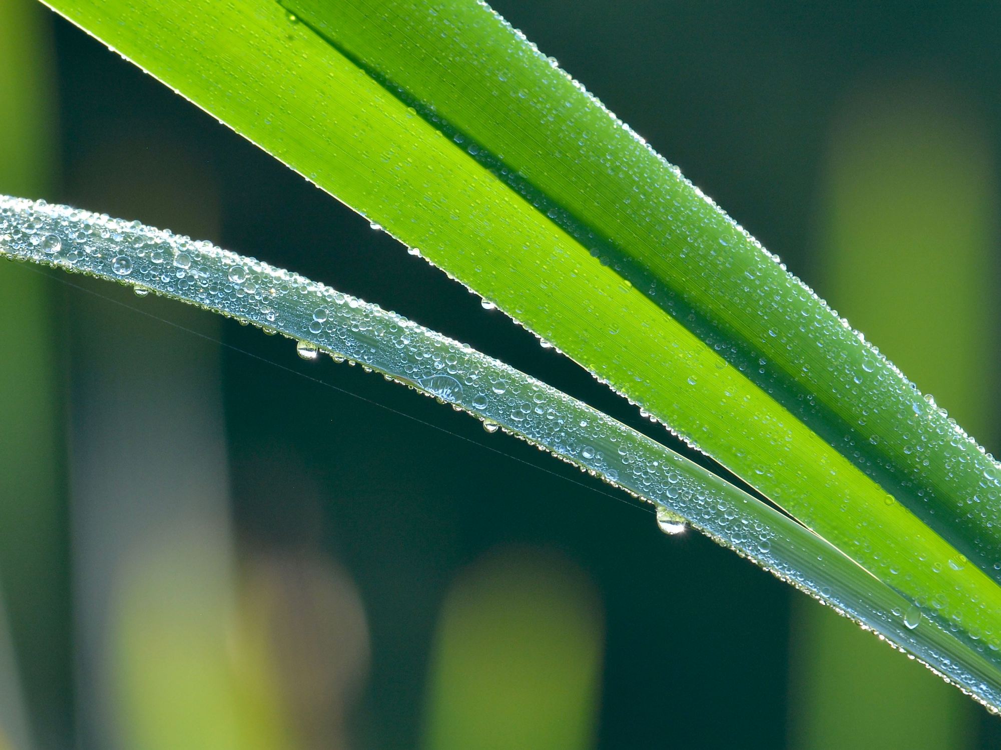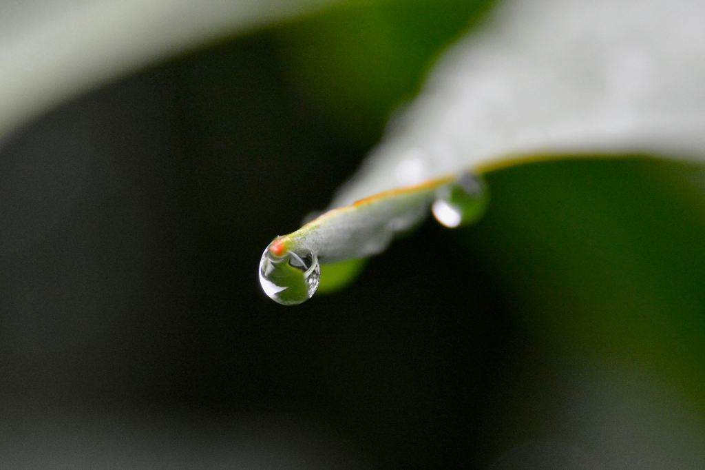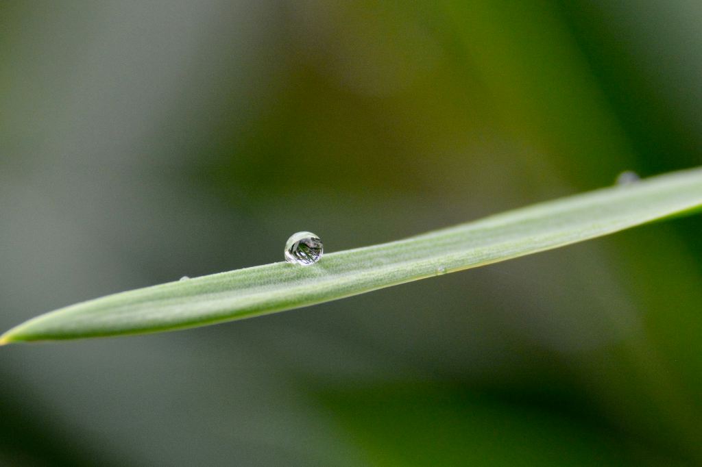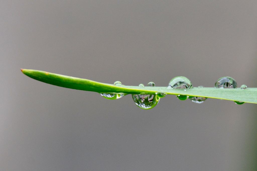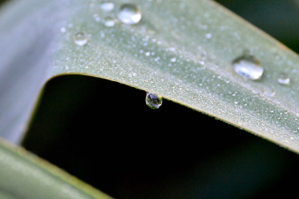 The rest of the pictures are from the yucca plants in my back yard. (A photo outing I could take in my pajamas!) The challenge here was to find a solid or blurry enough background that would highlight the water droplets. When I looked through the photos, I was also amused to see reflections of my messy patio in some of the drops. The first photo below showcases the bright orange buckets from Menards that I’d been using for herbs, for example.